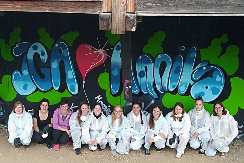 Graffiti Junggesellinnenabschied \“JASMIN & NICO\“ Ein Junggesellinnenabschied muss nicht immer mit peinlicher Verkleidung und im Vollrausch enden! Den Beweis dafür liefern wir hier:
