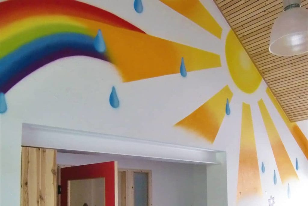 Für den Kindergarten „Regenbogen“ in Geislingen-Binsdorf malte Simon mit Sprühdosen eine Wand im Eingangsbereich der Kita mit Regenboden, Sonne und Regentropfen.