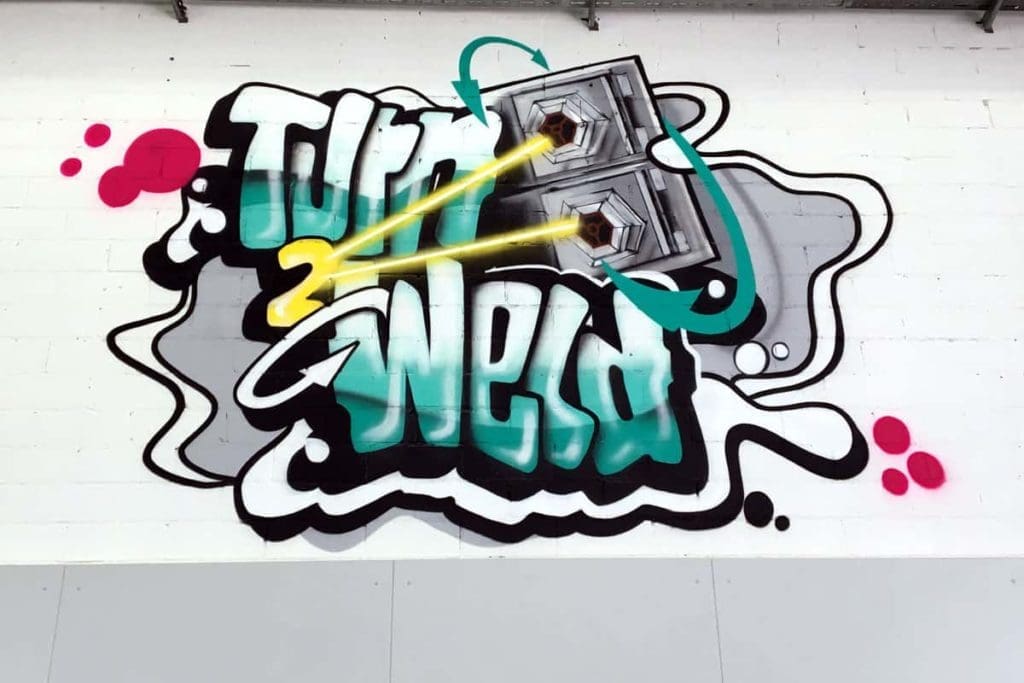 Teambuilding einmal anders! Flo malte mit der Belegschaft von Hurra Communications einen stylischen Schlachtruf im Graffiti Style!