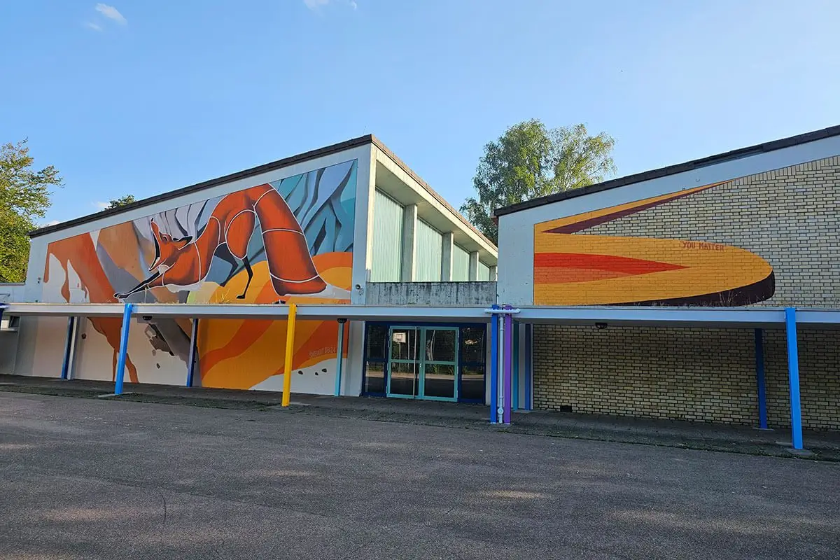 Jan, bekannt für seine einzigartigen Designs, wählte als zentrales Motiv einen Fuchs, der das Logo der Gemeinschaftsschule repräsentiert. Die lebhaften Farben in Orange, Rot und Brauntönen harmonieren perfekt miteinander und schaffen eine einladende Atmosphäre für Schüler und Lehrer.