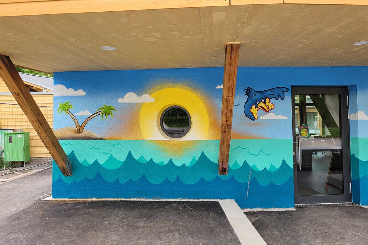 Erleben Sie die farbenfrohe Graffiti-Fassadengestaltung des Kinder- und Jugendhauses Feuerbach – inspiriert von Meer, Insel und Schiff. Besuchen Sie uns!