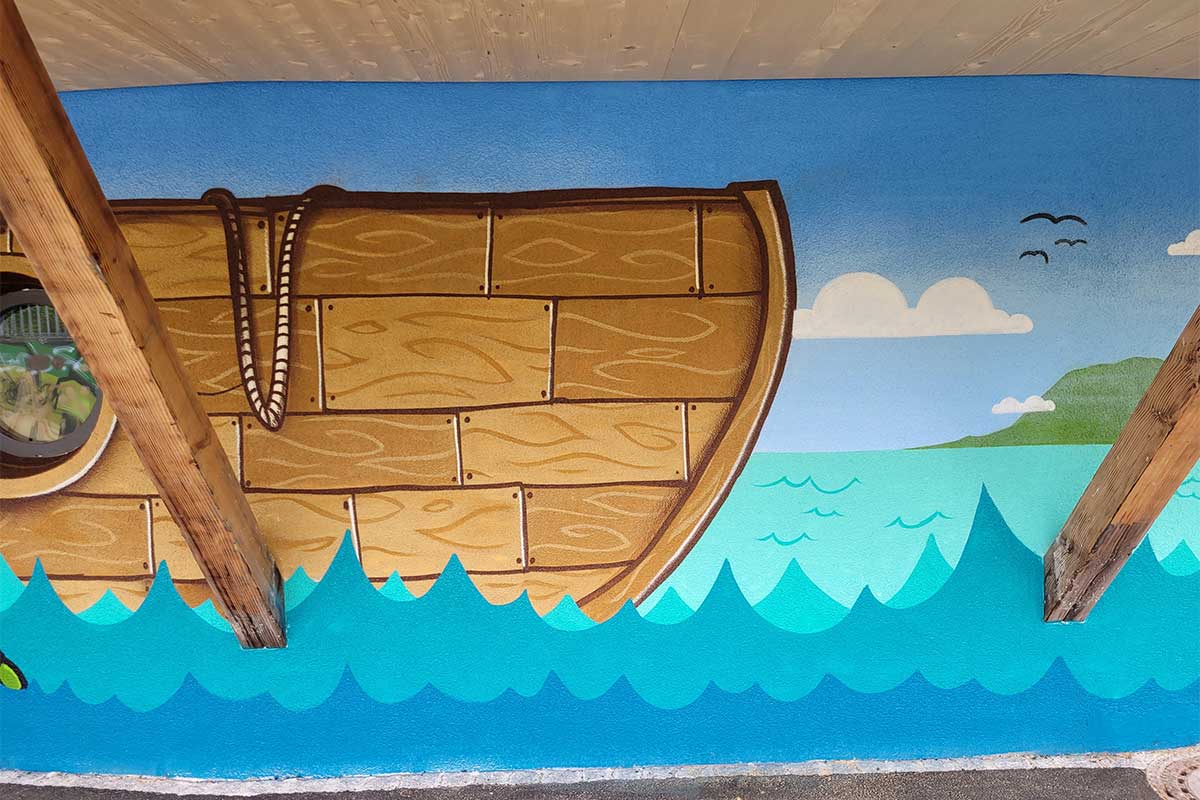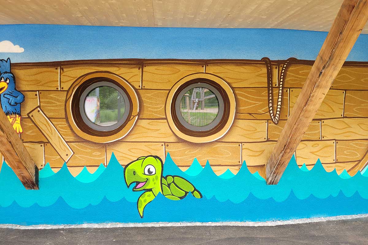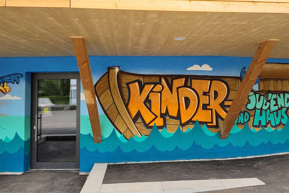 Auf dem Graffiti sind verschiedene Elemente zu sehen, die zusammen eine lebendige Szene bilden: Ein großes Holzschiff mit Bullaugen, das über die blauen Wellen des Meeres fährt, während ein Delfin fröhlich daneben schwimmt. Der Himmel ist weit und blau, und im Hintergrund sieht man eine kleine Insel mit Palmen und strahlender Sonne. Inmitten dieser Szene prangt stolz der Schriftzug „Kinder- und Jugendhaus“, der das neue Zuhause für Kinder und Jugendliche in Feuerbach markiert.