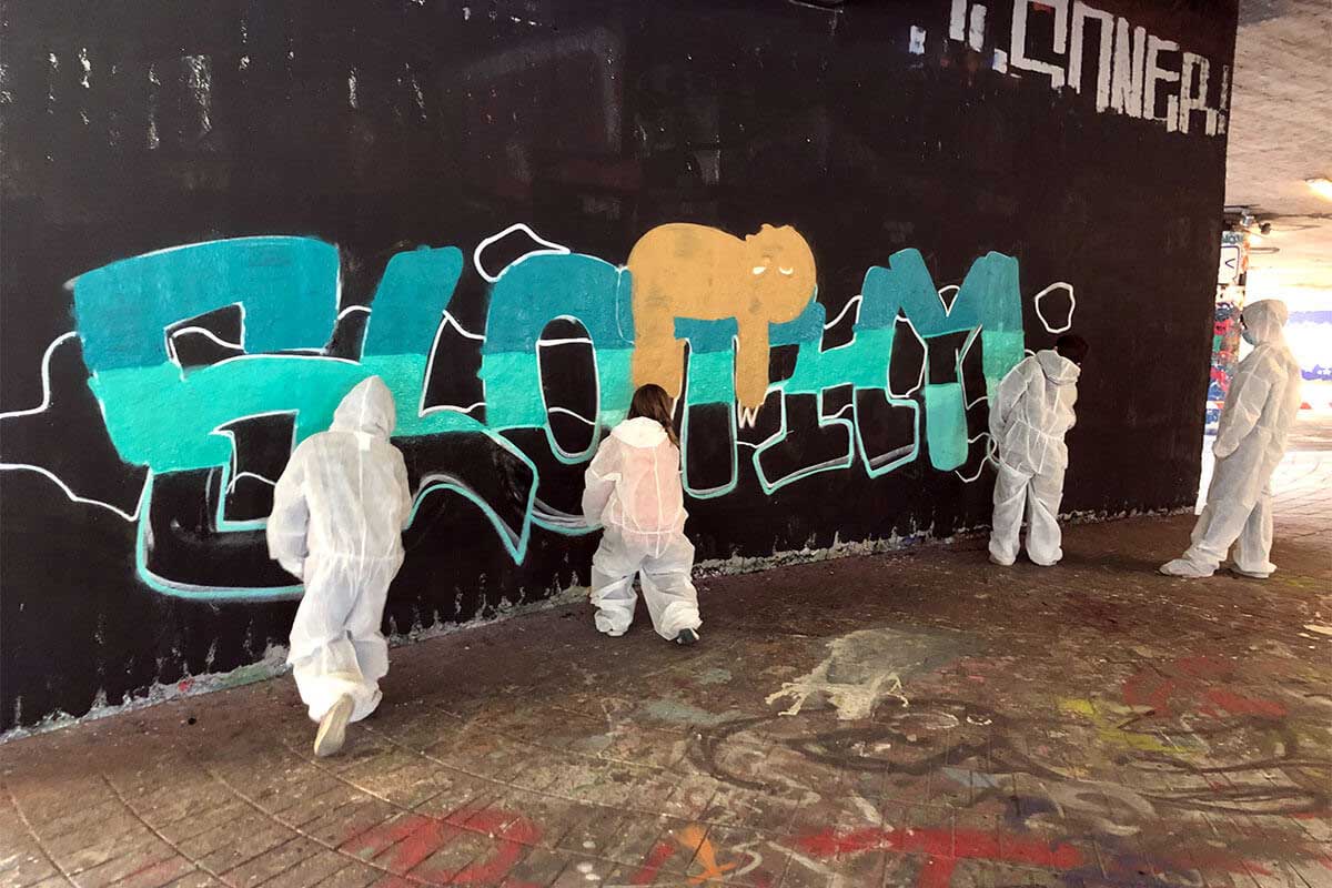 Anschließend malte Luis mit seinen Freunden den Graffiti Style mit allen Buchstaben und Elementen farbig aus.