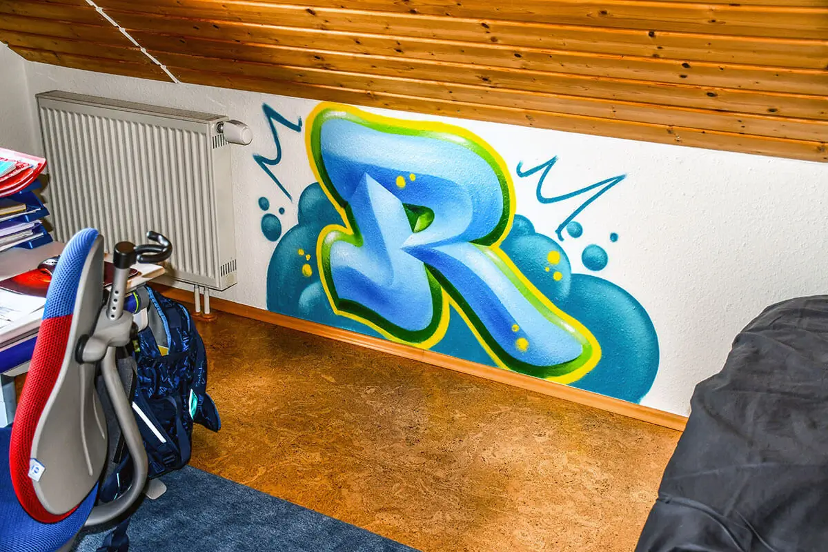 Jedes der beiden Zimmer erhielt eine individuelle Gestaltung. So wurden die Anfangsbuchstaben „R“ und „L“ für Rouven und Lisanne jeweils an prominenter Stelle im Raum platziert und in einem leuchtenden und kinderfreundlichen Graffiti-Stil gesprüht. Dieses Detail verleiht den Zimmern eine persönliche Note und stärkt die Bindung der Kinder zu ihren eigenen Räumen.