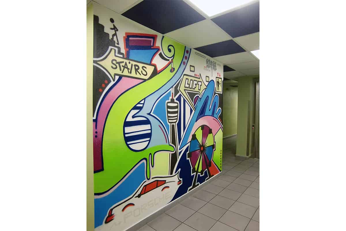 Simon sprühte ein Farbenfrohes Graffiti mit Wegweisern zur Treppe und Fahrstuhl auf die beiden Betonwände. So fühlen Sich die Besucher des Hotels schon Willkommen und finden den Weg ins Hotel.