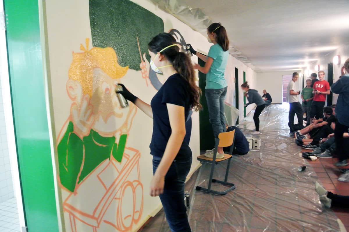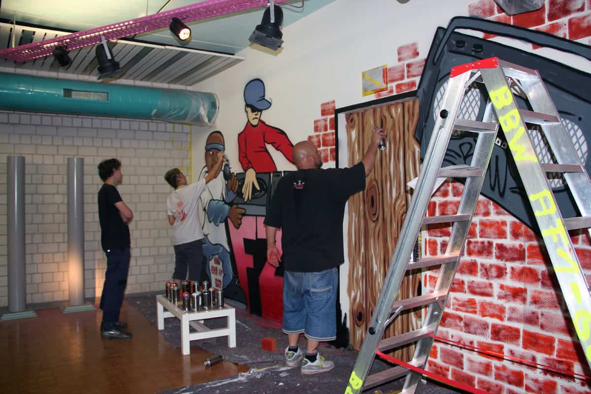 Wir von Graffiti Stuttgart wurden vom Berufsbildungswerk in Waiblingen damit beauftragt, das Freizeithaus der Schüler in einem Workshop mit coolen Graffitis zu verschönern. Nun haben die Schüler eine jugendgerechten Rückzugsraum, dessen Bilder sie noch lange erfreuen werden.