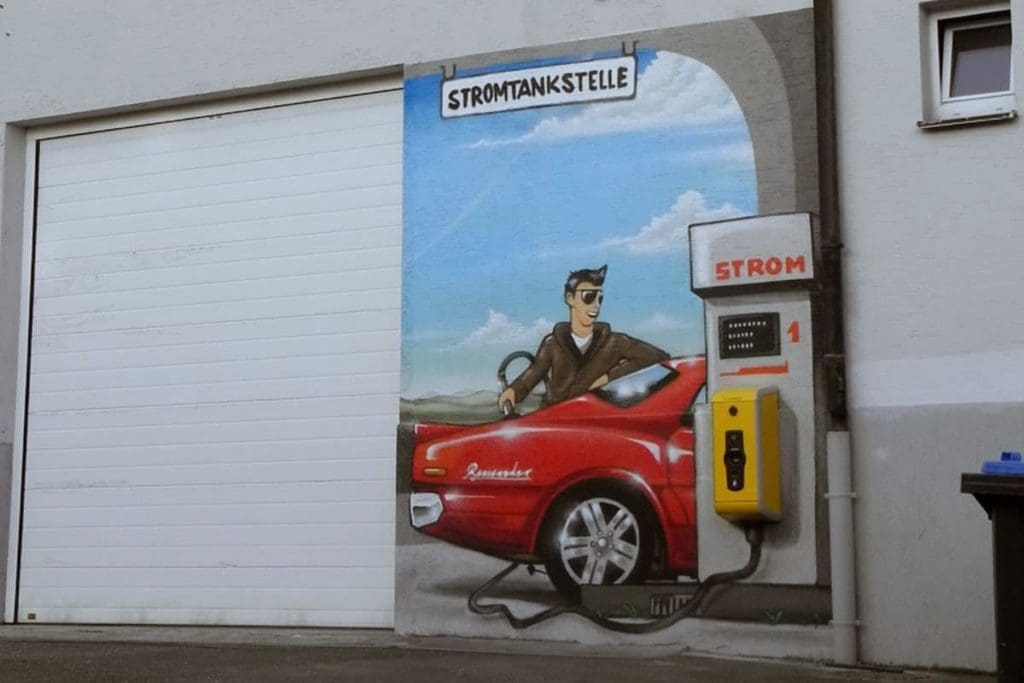 Für eine neue Stromtankstelle in Schorndorf wurde Graffiti-Stuttgart.de beauftragt eine Hausfassade im Look einer Tankstelle zu gestalten. Ziel war es, die Stromzapfsäule in einen Hintergrund einzufassen und somit aus der Zapf Anlage einen “Hinkucker\“ zu kreieren. Max bemalte die Hauswand mit einem Mann der gerade sein “cooles” Muscle Car mit Strom betankt.