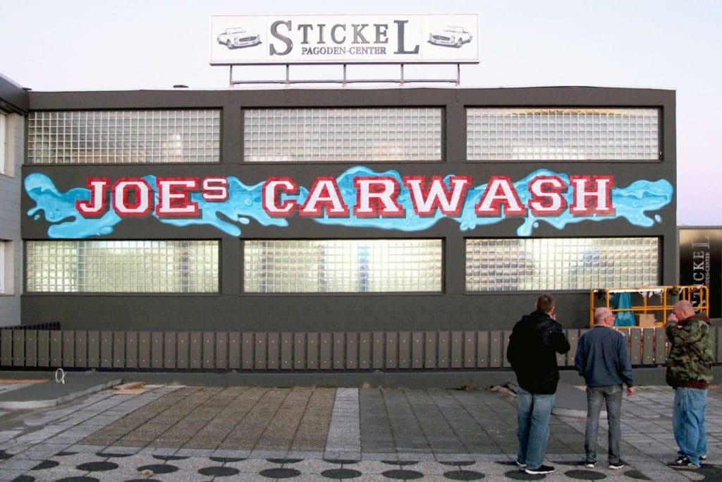 Für unseren Kunden, den Oldtimer Restaurationsbetrieb „Stickel- Pagoden Center“, haben wir von Graffiti-Stuttgart für ihre neue Waschstraße einen riesigen Werbeschriftzug auf die Fassade gesprüht. Patrick, Jan und Benny sprühten ganze drei Tage auf einem Steiger stehend, den 18×2 Meter großen \“Joes Carwash\“ Logo Schriftzug der neuen Waschanlage, die Ende Januar eröffnet wird.