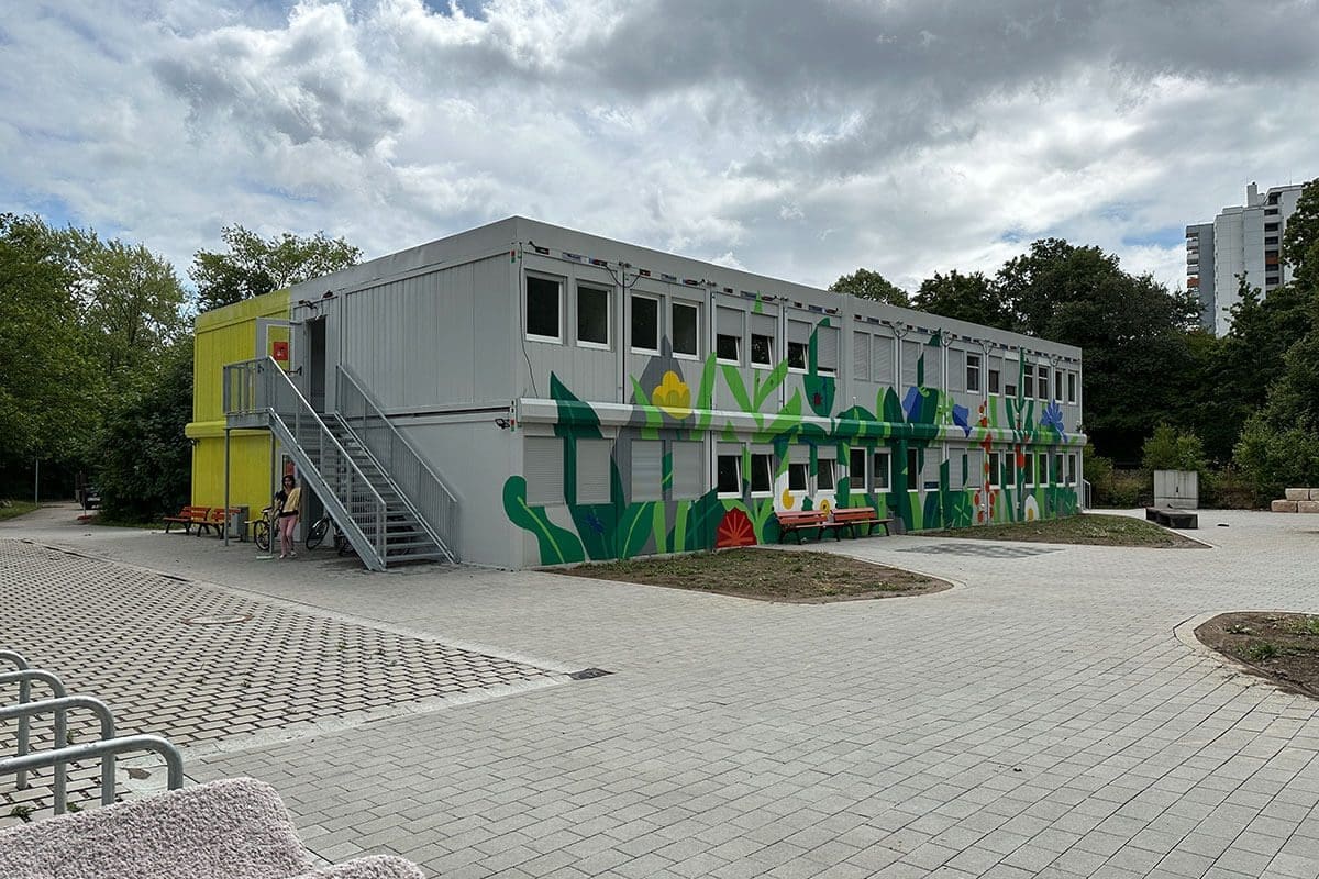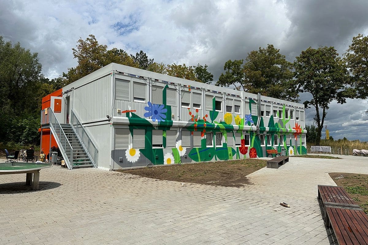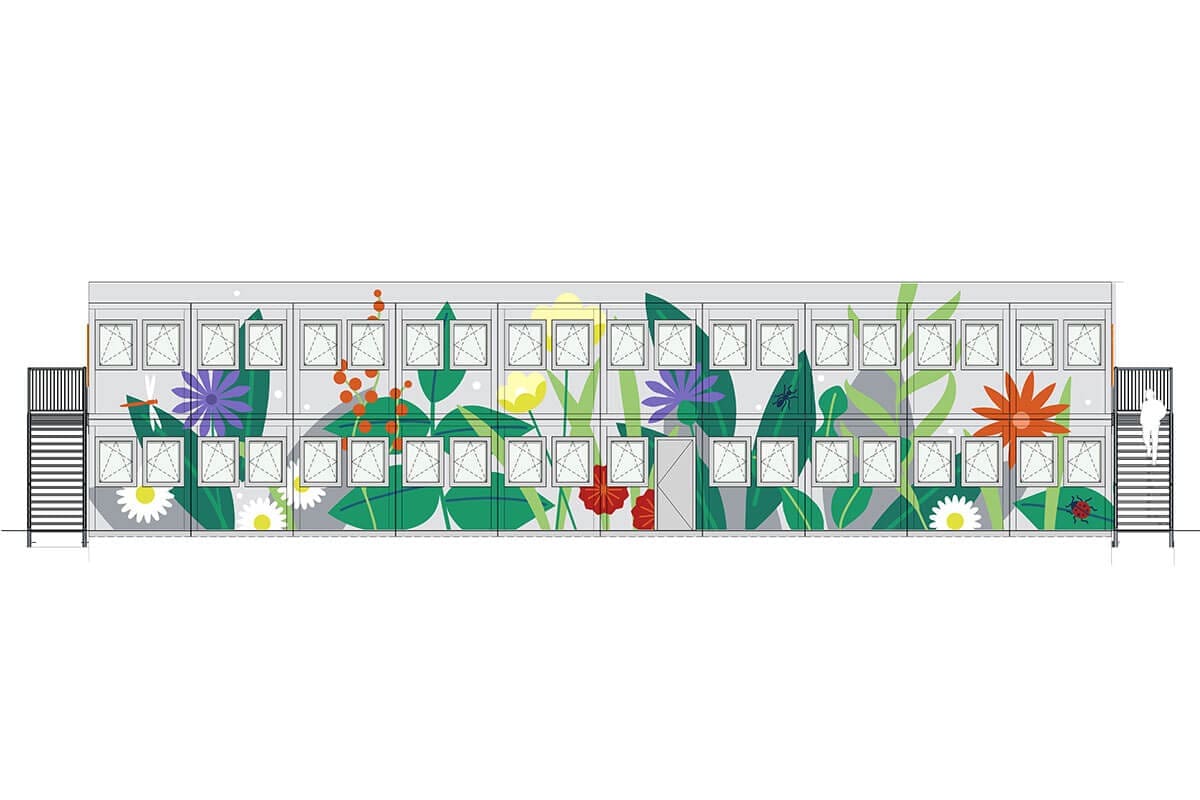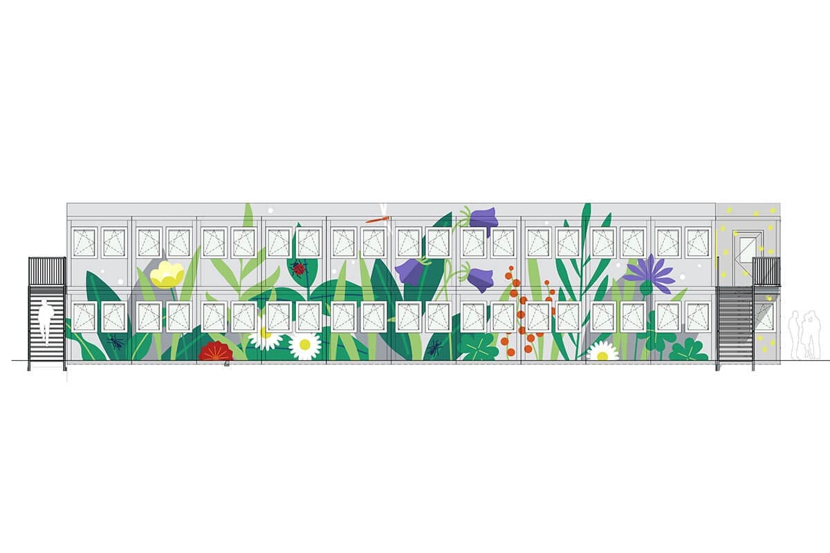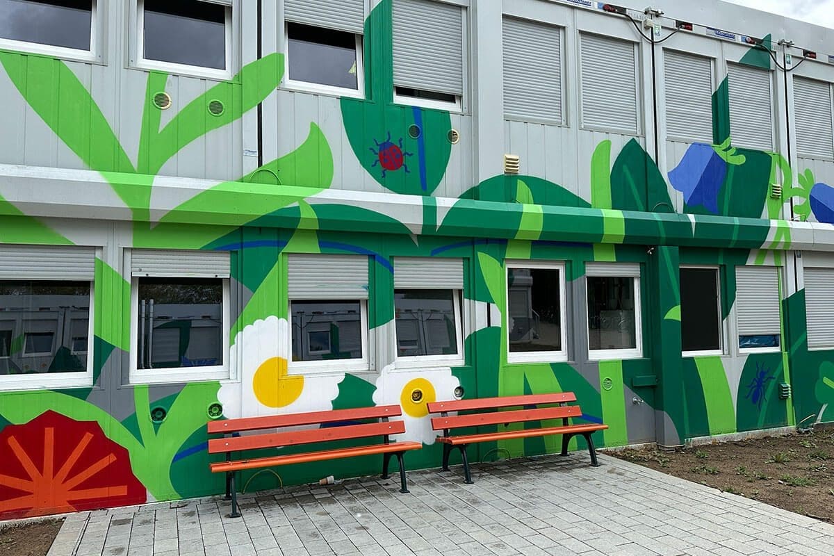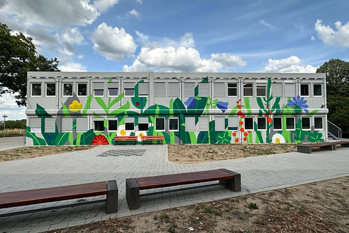 Die innovative Gestaltung des Wohnheims basiert auf einer nachhaltigen Bauweise: Eine bestehende Containeranlage wurde umstrukturiert und ergänzt, um das geringe Budget einzuhalten und gleichzeitig einen funktionalen Raum zu schaffen. Doch das Konzept geht weit über die reine Funktionalität hinaus. Die florale Gestaltung, die Graffiti Stuttgart zusammen mit dem Künstler Moritz und der Illustratorin Maike umgesetzt hat, verleiht dem Innenhof eine warme, lebendige Atmosphäre.